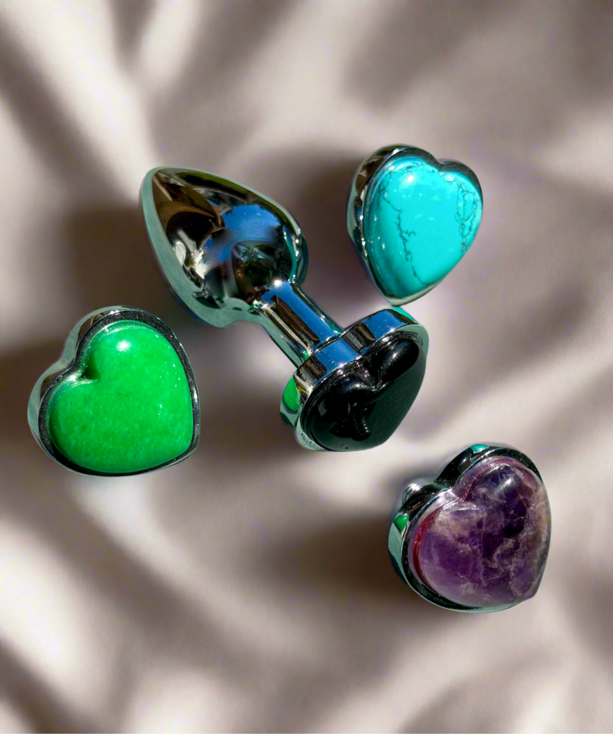 Unlock a world of sensual elegance/allure with the Heart Gem Interchangeable Plug. Crafted from smooth stainless steel, this stunning little heart-shaped plug comes with four dazzling gemstone ends—turquoise, amethyst, black onyx, and Malaysian jade—each offering a unique energy to match your mood. Whether you’re feeling calm, bold, or mysterious, switch the gem to elevate your intimate play. Designed for both beauty and pleasure, this luxurious piece is perfect for those who crave a touch of sophistication in their most private moments.