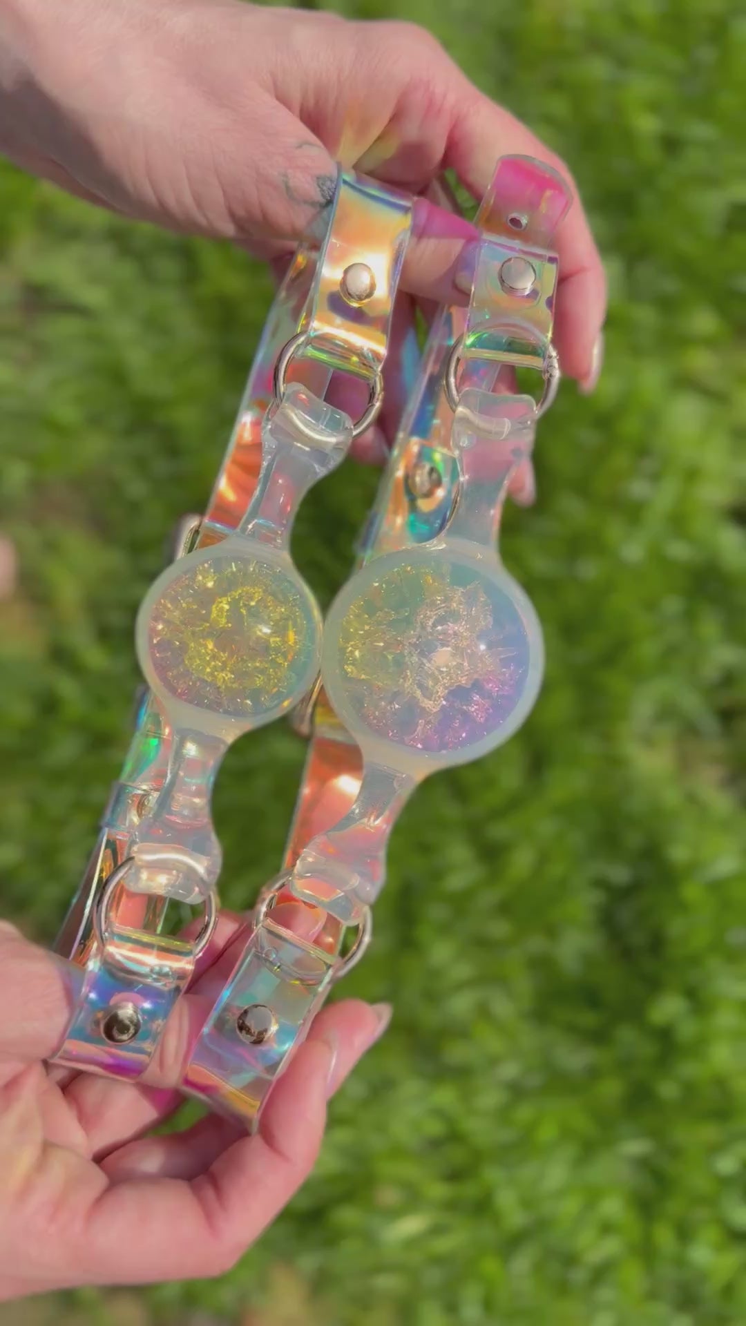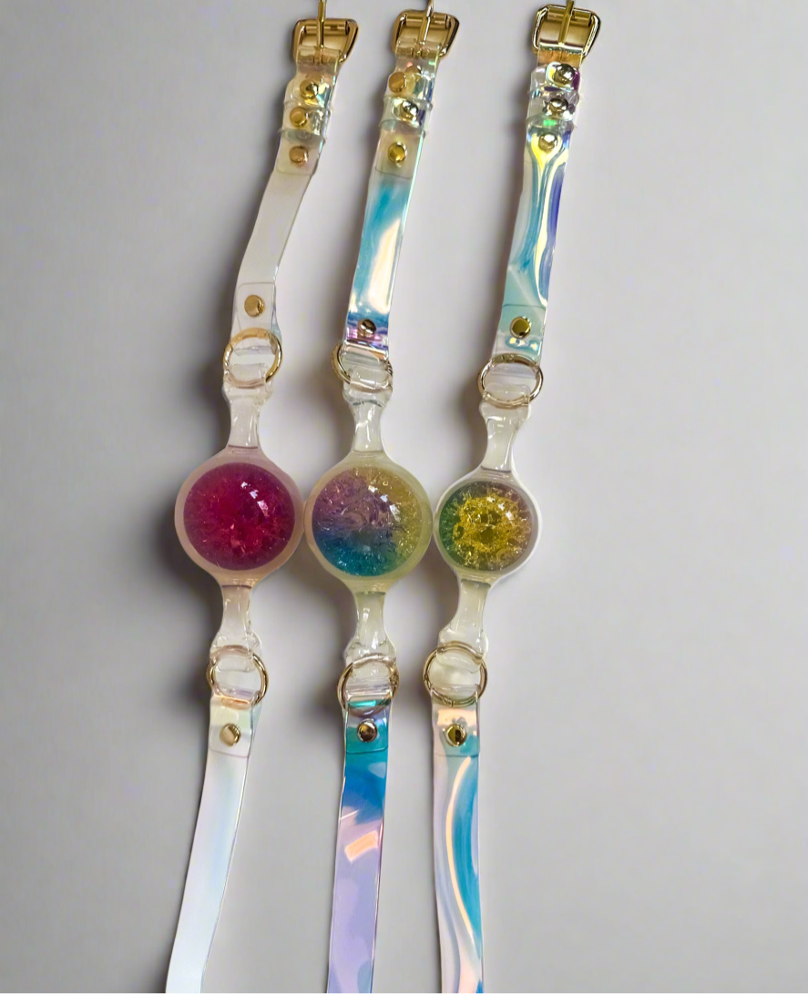 This isn’t your average ball gag. With a soft, transparent silicone shell that’s gentle on your jaw and a firm rainbow-textured core that flashes like a crystal, this beauty bites back—without wearing you out. Perfect for long scenes, playful restraint, or just looking damn good while keeping quiet.